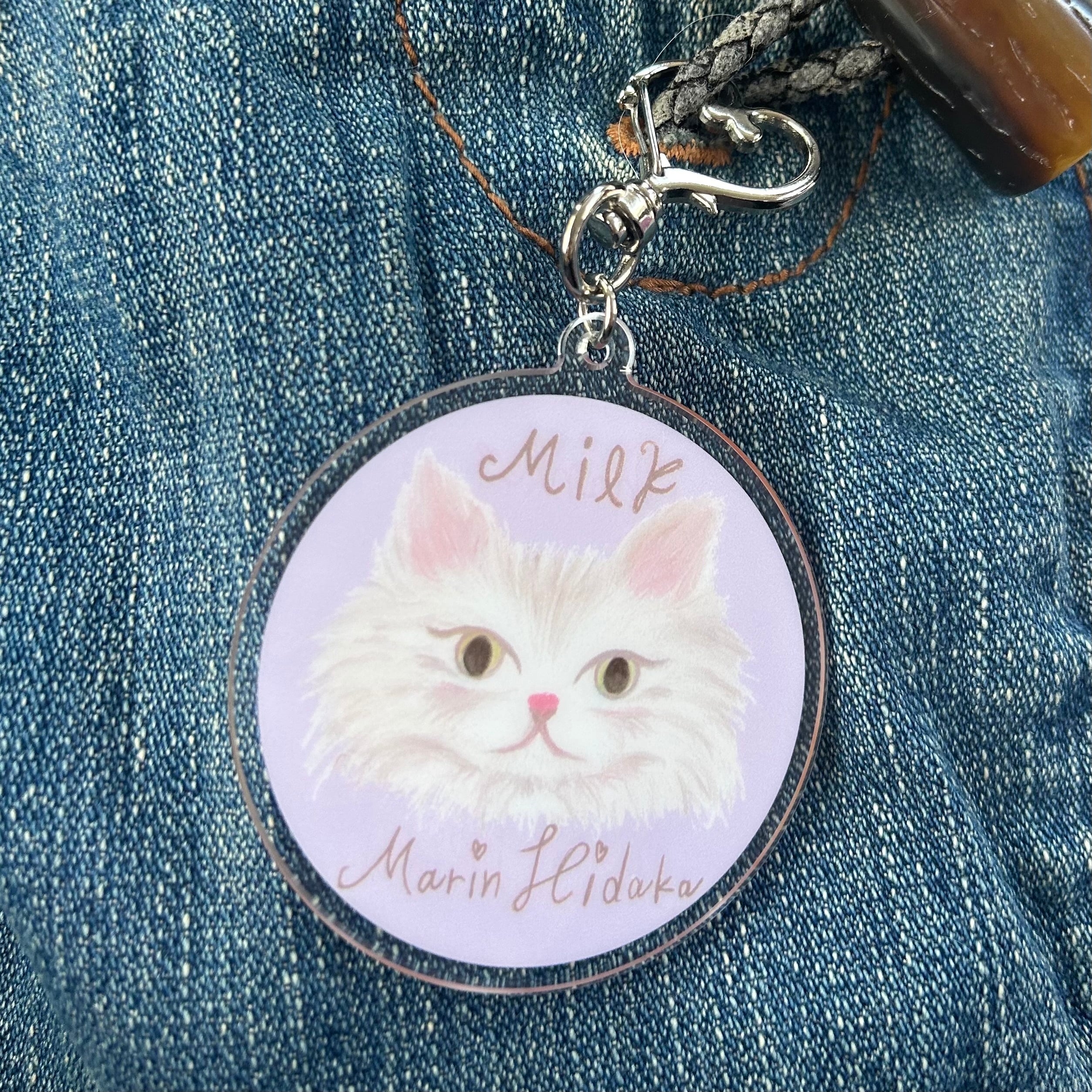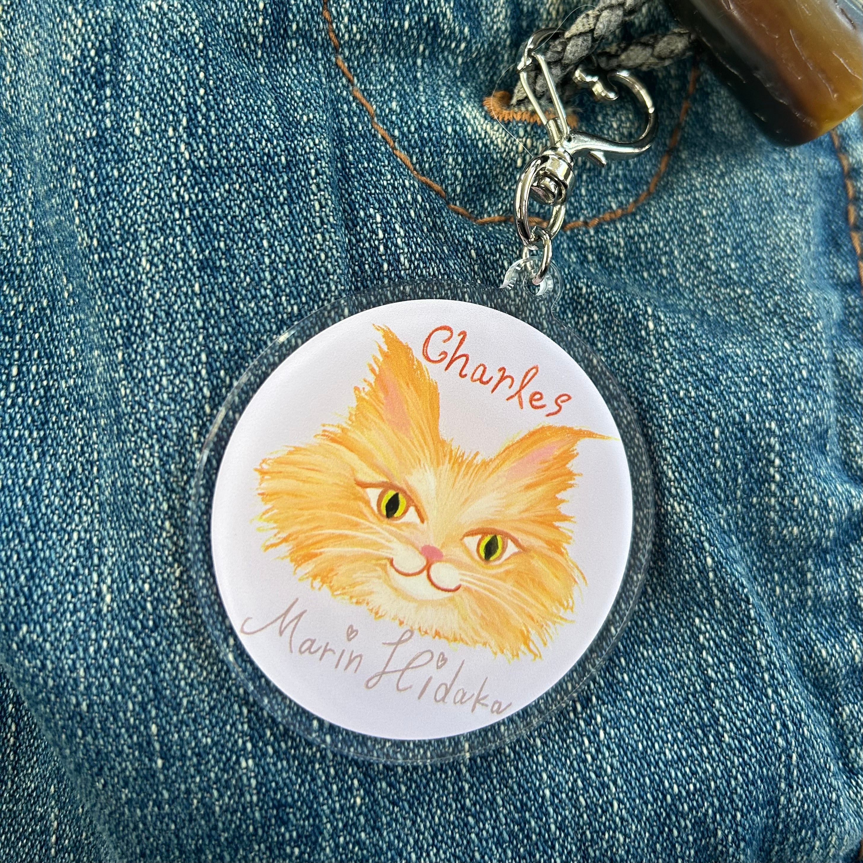 愛猫シャルルとミルクの絵を両面に描いたアクリルキーホルダー。オンラインストア開設記念ブロマイドポストカード付き。